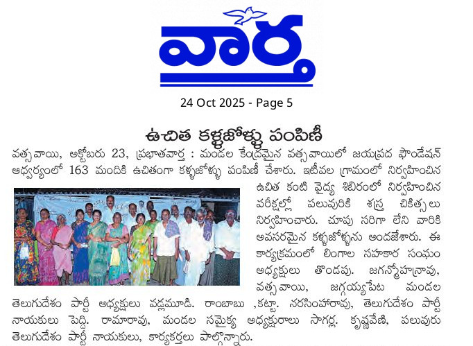 October 27, 2025జయప్రద ఫౌండేషన్ ఆధ్వర్యంలో ఉచిత కంటి మరియు వైద్య శిబిరాలు