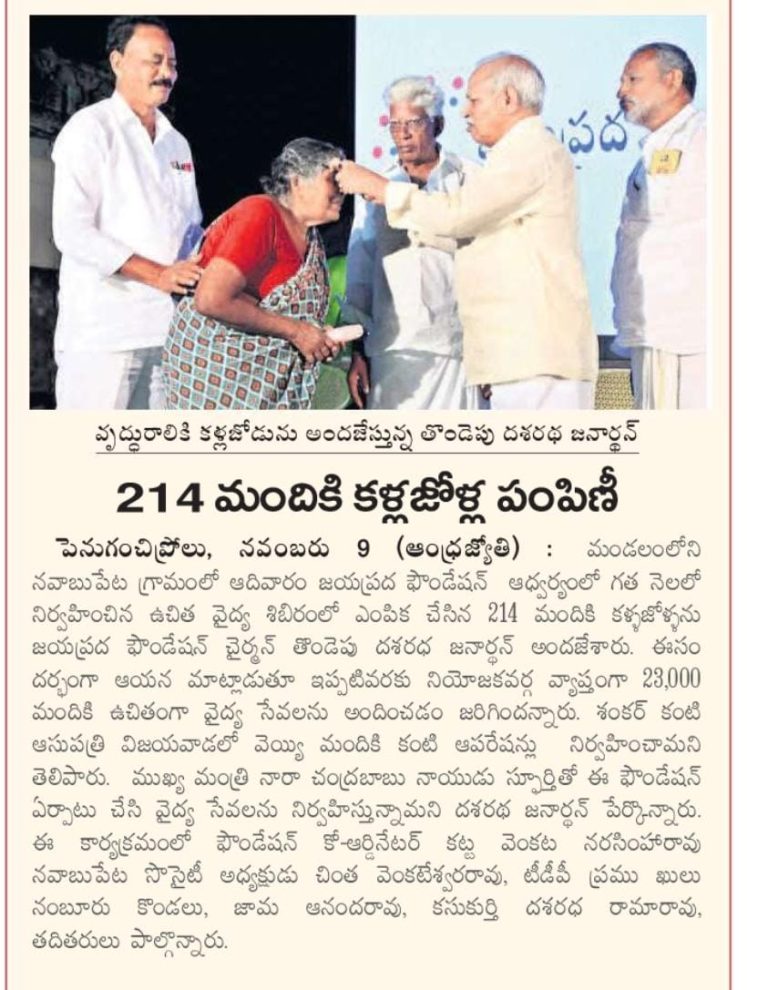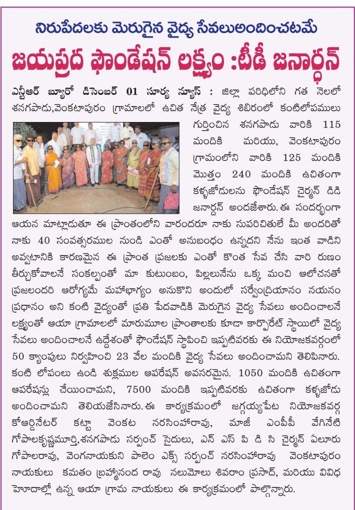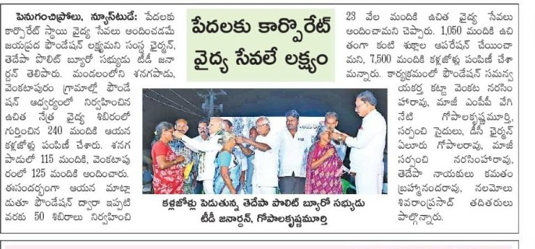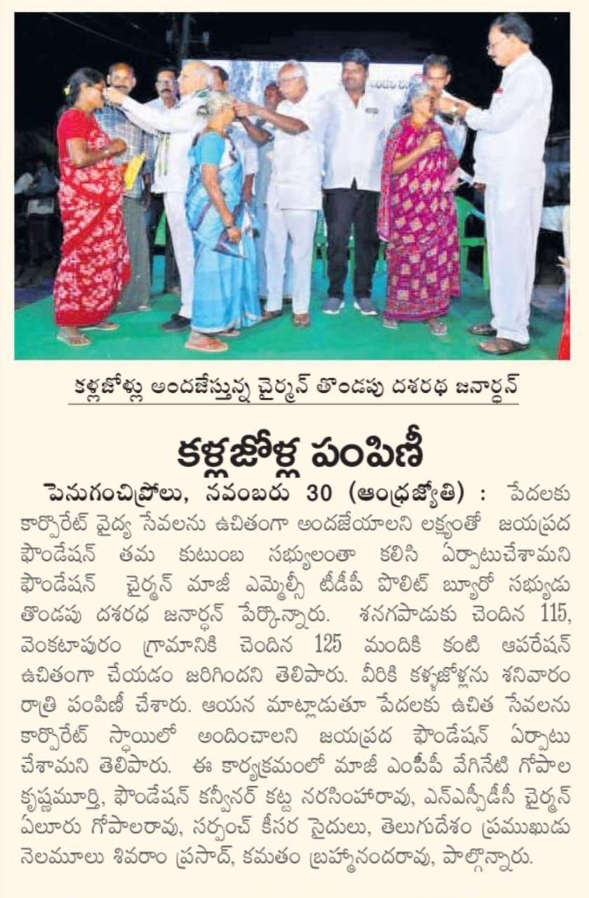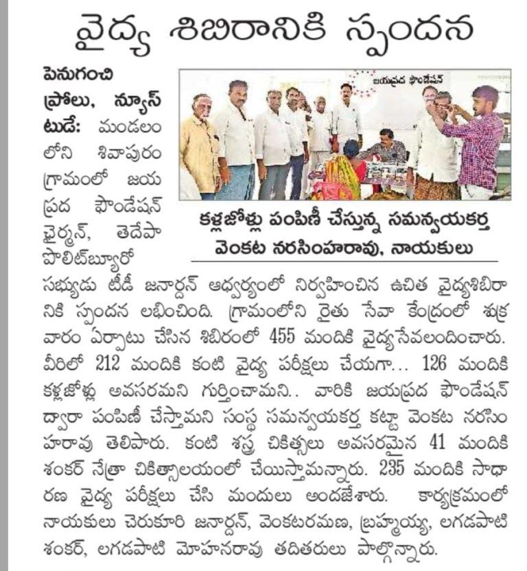 • జయపà±à°°à°¦ ఫౌండేషనౠఆధà±à°µà°°à±à°¯à°‚లో ఉచిత వైదà±à°¯ , à°•à°‚à°Ÿà°¿ పరీకà±à°·à°²à±, à°¶à°¸à±à°¤à±à°° à°šà°¿à°•à°¿à°¤à±à°¸à°²à±, à°•à°³à±à°³ జోళà±à°² పంపిణి