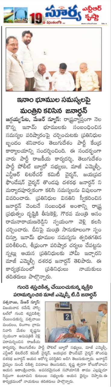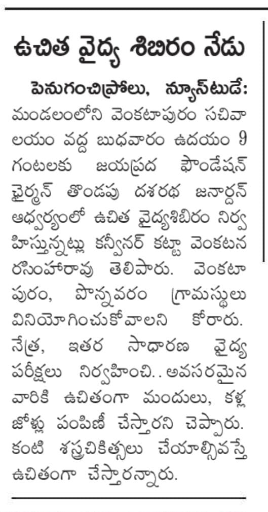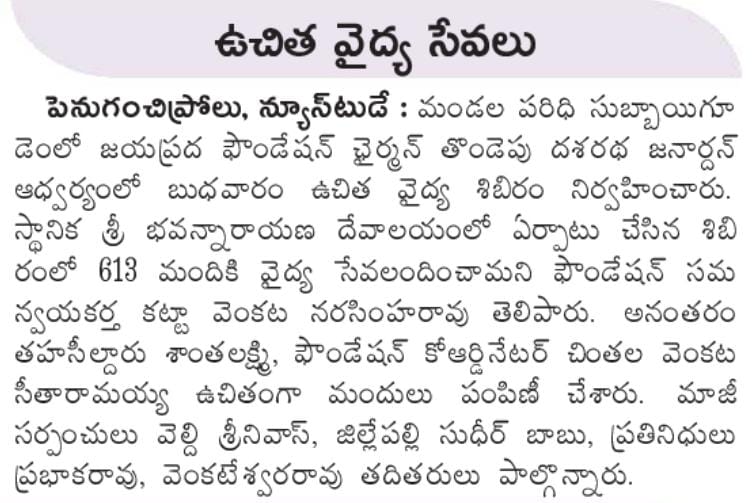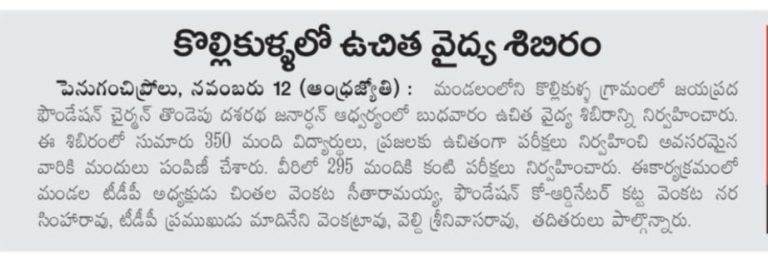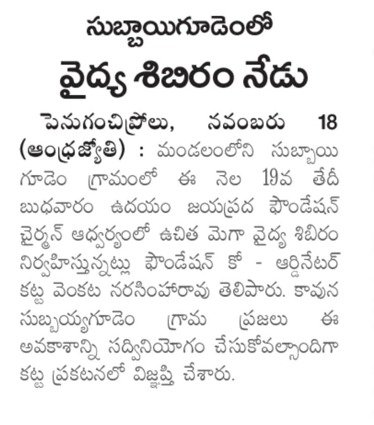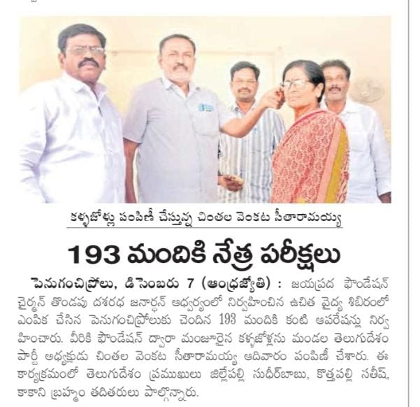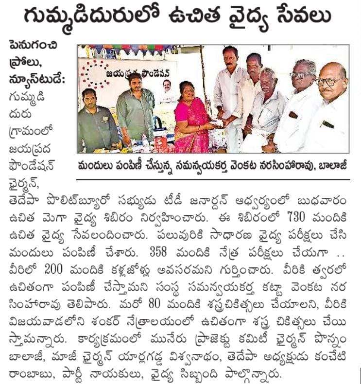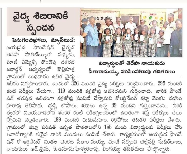 • జయపà±à°°à°¦ ఫౌండేషనౠఆధà±à°µà°°à±à°¯à°‚లో ఉచిత వైదà±à°¯ , à°•à°‚à°Ÿà°¿ పరీకà±à°·à°²à±, à°¶à°¸à±à°¤à±à°° à°šà°¿à°•à°¿à°¤à±à°¸à°²à±, à°•à°³à±à°³ జోళà±à°² పంపిణి