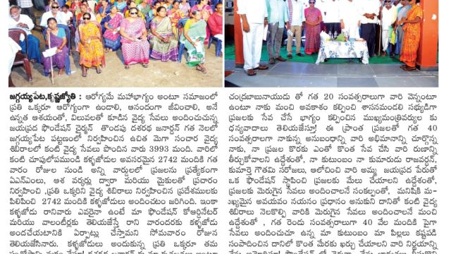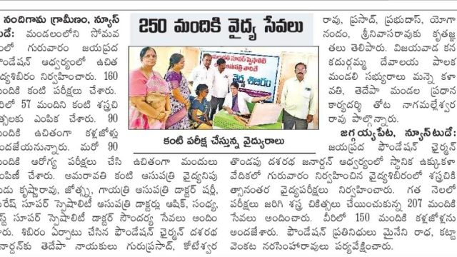 • జయప్రద ఫౌండేషన్ ఆధ్వర్యంలో ఉచిత వైద్య , కంటి పరీక్షలు, శస్త్ర చికిత్సలు, కళ్ళ జోళ్ల పంపిణి